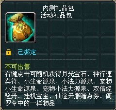 登录送、在线送、升级送、打怪送,想不被送更是难上加难!价值520元人民币的大礼包等待着你的开启!元宝白送,仙石无数,宝图白拿。让你的修仙之路事半功倍。礼包内还包含了月光宝石、神行速卖符、阎罗令、双倍经验丹、挂机宝宝、赠点等实惠的奖励,其实仔细算过之后你会发现,包里物品的价值远超520块!