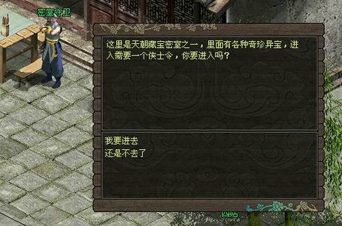 活动介绍:10级以上的玩家和密室守卫对话,交纳1侠士令以后可以进入藏宝密室,击败里面的50只护宝神兽就有机会得到丰厚的奖励。