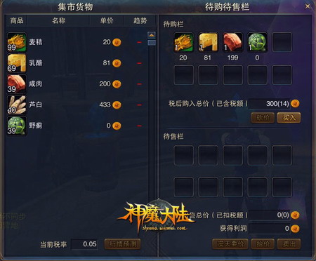 《神魔大陆》研发团队以现实世界与经典奇幻设定为参考,设计了16大类上百种商品,包括农产品、水产品、香料、纺织、服饰、文化艺术品、金属、宝石等等等等,这些商品又具备各自的产地与畅销地点。玩家用“墨丘利币”在各地之间买卖商品,所得盈余即可成为个人收入!