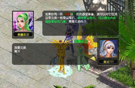 比普通星钻威力更强的“超级星钻”,终于可以通过炼金来合成了,天使“奥蕾莉亚”还为大家提供了神奇的“幸运宝石”来增加合成超级星钻的成功率。通过炼金就可以将星钻合成“超级星钻”,使用“幸运宝石”还能增加合成的成功率(配方三的成功率是最高的)。“幸运宝石”需要用一件太阳4级以上6级以下的装备或武器在天使“奥蕾莉亚”处换取。换取时必须将这件装备放在物品栏的左上第一格。而且“幸运宝石”在合成“超级星钻”时会自动消耗,合成后的“超级星钻”只能角色本人使用。