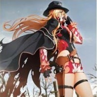 飘逸的金发、扬起的披风、性感的美腿配合腰间的左轮,将女枪手的飒爽英姿表现得淋漓尽致。在蓝白色背景下,一袭黑红色的搭配更让她多添了几分孤傲与高贵气质。