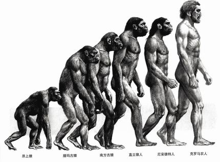 这是一张人类进化示意图。人类进化过程中,除了外貌有明显变化之外,在行为表现上也有很大的改变。