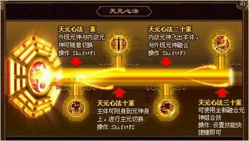 注:“天元心法”无等级限制,只要有元神,你便能修炼,学的心法第一重,内敛元神和外现元神即可随心所欲切换,勇士们只要带上元神,到中州王城“魔法阵祭祀”处即可学习天元心法,由此传奇世界的新境界便为你展开。