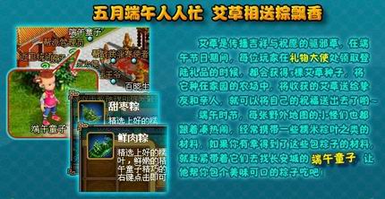 活动简介:活动期间,每天登陆礼品都附赠3颗艾草种子,可以在农场中播种收获,成长周期极短。收获艾草之后可以赠送给好友,获得好友度和经验的上升。端午佳节,用艾草传递祝福。将艾草亲手送给你的朋友,那么你们两人都会获得经验奖励。