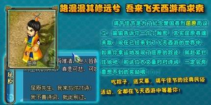 活动简介:活动期间,野外任一地图会刷新出“屈原NPC”,对话后进行对诗,同时开始进入1分钟倒计时,倒计时结束时,屈原消失。任何看到屈原的人都可以在他未消失前和他反复对诗。选择正确就可以获得奖励。然后屈原NPC消失,消失后同时随机刷到任意地图的某位置上。如果屈原NPC刷出后10分钟都未被玩家点击,则自动消失,刷到任意地图的某位置。