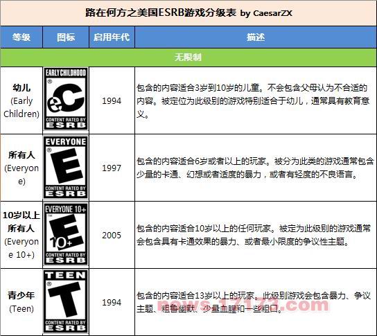 CERO与美国ESRB的对比如下:“A”——介于ESRB的E级和E10+级之间。