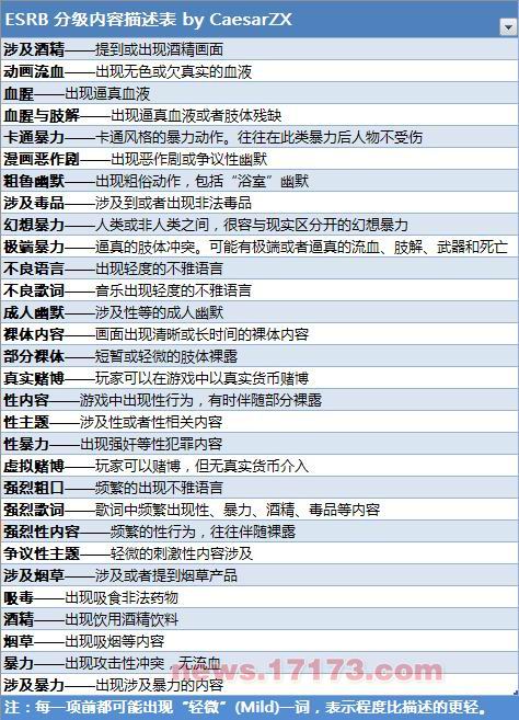 目前,RSRB将游戏分为7个等级,请看如下表格: 而详细描述标识的文字内容也是有规范的,列表如下: ESRB的分级流程:要获得一款游戏的分级,发行商必须提供ESRB一份记录了游戏中最极端内容的影像。发行商还要以填表形式对游戏内容进行描述,并支付一比以游戏开发成本为基础的费用(美国手续费不便宜啊):
