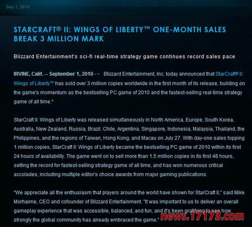 暴雪娱乐公司日前公布:旗下即时战略游戏大作《星际争霸2》自2010年7月27日在全球11个地区国家同步发售以来,首月销量已经超过了300万,成为2010年销量最高的PC游戏,同时也刷新了即时战略游戏的最快销售纪录。暴雪总裁兼首席执行官迈克·莫汉尼(Mike Morhaime)对媒体表示:“我对全球有这么多玩家能够接受《星际争霸2》感到高兴。对我们来说为玩家带来上手简单、有趣且平衡的游戏体验是非常重要的,而且看到《星际争霸2》把全球玩家的距离拉近是多么让人愉悦啊。”
