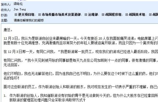 联游CEO邮件质问唐骏:已获暴利为何还裁员