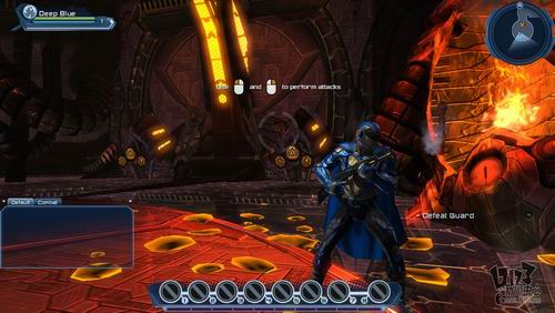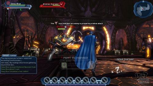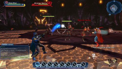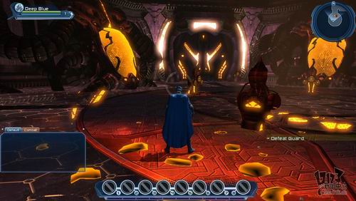 游戏初期让你在外星人的飞船里四处晃悠,同时进行战斗指导,这里是对抗第一个小BOSS,一个巡查者。此外就是英雄还有三种特殊移动能力,分别为:飞行(超人)、工具跑步(蝙蝠侠)和快速移动(闪电侠)
