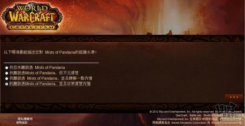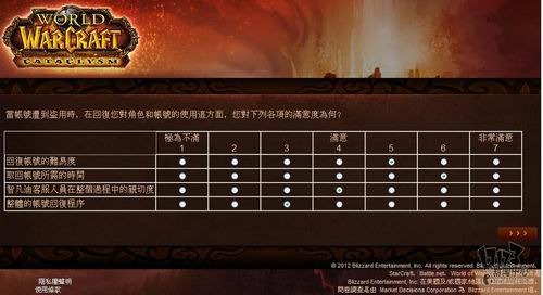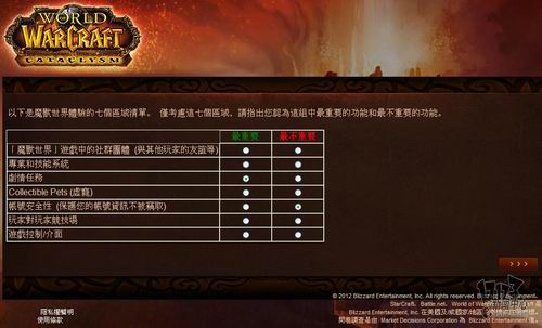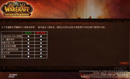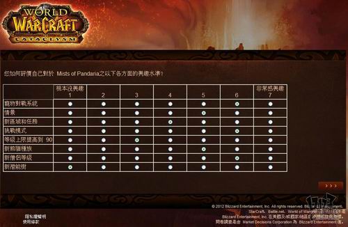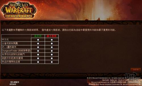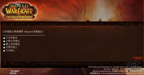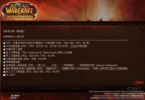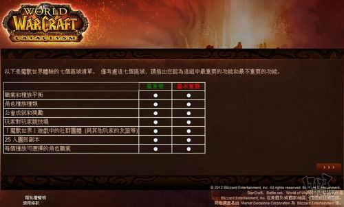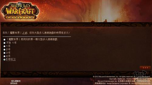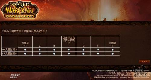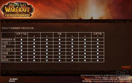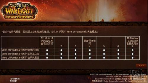 暴雪近日委托专业市场调研机构MDC Research对旗下核心网游产品《魔兽世界》玩家看法进行调研,调研内容包括对目前魔兽世界的看法、对竞争产品的喜好程度,游戏习惯以及对新资料片“熊猫人之谜”相关内容的了解程度。由于MDC Research是一家非游戏性的英文调研机构,这次是用的中文语言也是繁体中文,所以这个调研中也存在一些让人哭笑不得的错误,譬如把《火炬之光2》称作《手电筒2》这样的。不管怎么说,你的意见都将成为暴雪改善魔兽世界,并把新资料片做的更好的重要依据,如果有时间的话,不妨填下这份问卷吧:(文:17173 晨星)