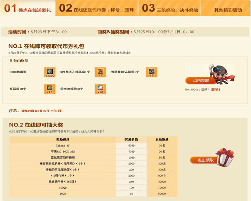 今天下午即将登场的三大重量级主流活动之一:整点在线有礼堪称史无前例的手笔豪迈!届时百万在线勇士人人都将获得从天而降的双份福利!其中包括1份奢华尊贵礼包内含3300代币券等丰富奖励。此外玩家们还将同时拥有一次怦然心动的抽奖机会,冲刺iPhone4S、苹果Mac Book Air等酷炫奢华数码潮品以及稀有宠物神紫恐龙蛋等游戏道具奖励。