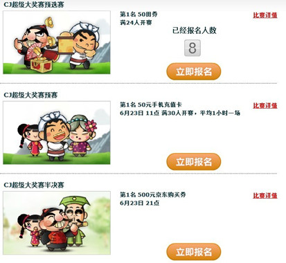 《天天斗地主》ChinaJoy超级大奖赛自2012年6月18日在联众新世界平台同步开启,截止至7月18日将进行为期一月的比赛。大奖赛分为满24人即开赛的预选赛、每周六进行的预赛以及半决赛、决赛四个阶段,除了免费报名参赛的预选赛外,其他三个阶段比赛都要消耗“赛点”报名参赛。自比赛开启一周以来,已经有众多玩家参赛,赢得比赛积攒赛点成为现在玩家游戏的最大目标。