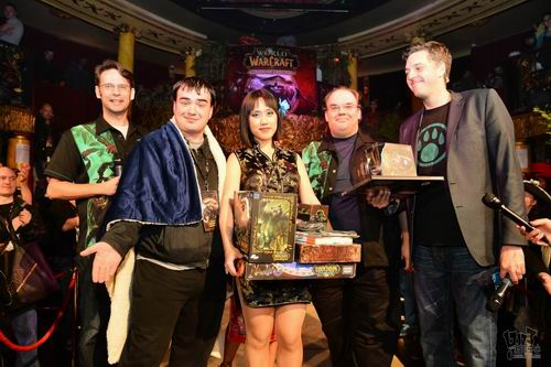 暴雪的魔兽设计团队成员(右二是几个主设之一,好像是负责任务的?)和玩家合影,司仪手上那一堆礼品很诱人啊