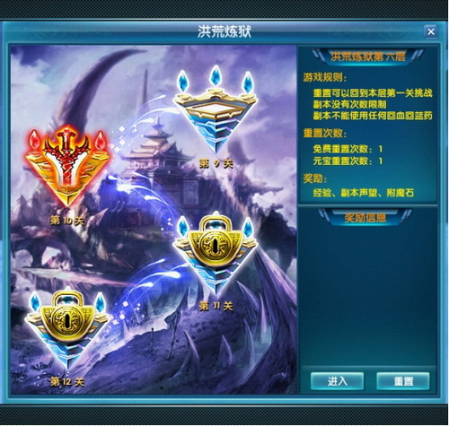 “洪荒炼狱”是一个单人副本,玩家需要一关一关挑战进入炼狱的最深处,每一层共有20关,一共7层。副本内不可使用任何道具回蓝,回血,击杀每一关内的所有怪物方可进入到下一关。每关挑战成功后都会获得大量经验已经极品道具。