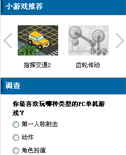 值得一提的是,我们在这里添加了小游戏栏目和调查。当玩家想换换口味时,不妨点击这些精选的Flash游戏。而调查也方便我们制作出更加贴近玩家的内容,提高我们与玩家的互动性。