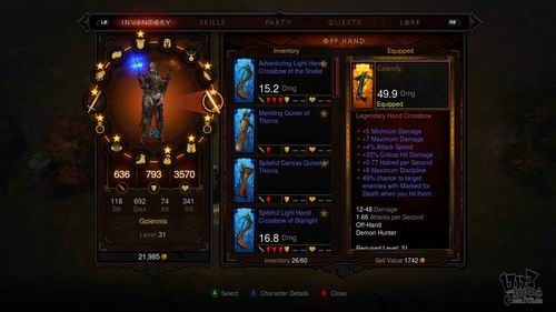 马特索:不,就像你看到的这样,我们对游戏的界面做了大幅度的调整,以适应组队系统的改变和主机版的浏览习惯,这主要体现在背包和装备界面,背包中的装备会自动分类,当选择对应格时,系统会自动列出所有此类的装备,此外,我们希望用更简单的模式来告诉玩家两件装备之间的属性差别,而不是一堆复杂的数字。装备对比被简化成红绿两种箭头,分别对应攻击、防御和生命三个基本属性,绿色的箭头代表提升,红色的箭头代表下降,一个箭头表示小幅度提升或下降,三个则表示大幅度提升或下降。玩家可以一目了然的明白,换上这件装备自己能够获得哪方面的提升,或是失去哪方面的属性。