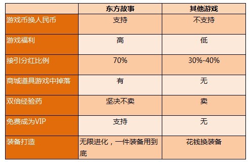 《东方故事》首创游戏币换人民币,接引分红高达70%,成长不收费,元宝级级送,商城道具游戏中掉落,价格便宜消耗低,赠送千格以上免费仓库,装备支持无限进化。
