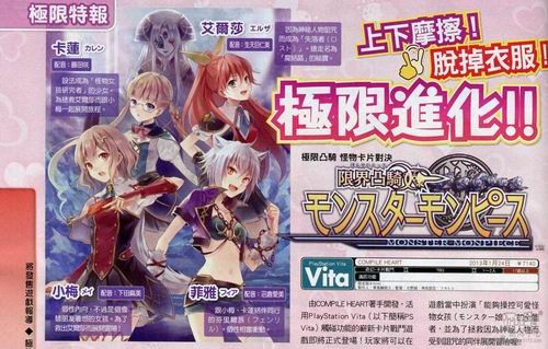 由日本Compile Heart公司发行,以美少女化的怪物为特色的PSV卡牌对战网游《限界凸骑》(英文名Monster Monpiece)日前宣布将发行国际版,预计今年春季即可通过美国和欧洲的PlayStation网上商店进行下载。然而,据内部人士透露,游戏公司被要求对游戏进行一些修改才可以发行,理由是游戏中的角色“过于性感”。