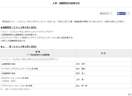 4月1日,株式会社SCE今天公布了有关人事、组织变更通知,值得注意的是新设了中国战略部,部长由前日本社交巨头GREE事业战略发展部总监添田武人担当。看来索尼今后对于中国市场十分看重,或许也意味着索尼PS系列行货即将进入中国。