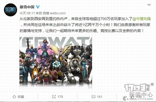 上周,暴雪**通过官方微博发布公告,称全球各地已有超过700万名玩家加入了《守望先锋》。由于是买断制收费,这也说明《守望先锋》在全球范围内的销量已经突破了700万份。截止到目前,来自世界各地的玩家已经在PC、PS4和Xbox One平台上战斗超过1亿1900万个小时。不知你开始“吸”《守望先锋》了没?