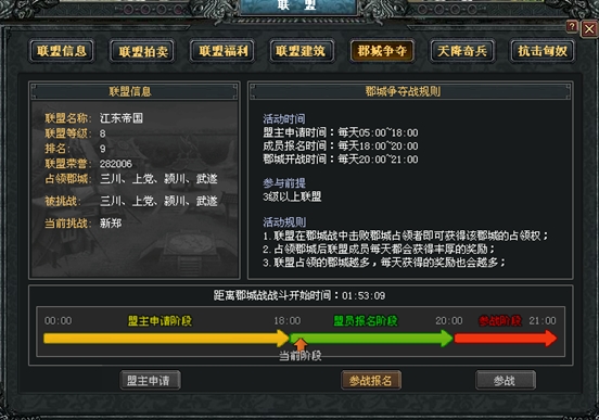小提示: ① 申请郡城争夺是会消耗联盟荣誉的,而且不论胜败消耗掉的荣誉是不会退还的; ② 花费联盟荣誉完成申请后,其他联盟玩家可以追加联盟荣誉,报名当日18点付出最多联盟荣誉的联盟获得当天的最终挑战权。 报名阶段当盟主成功申请之后,该联盟所有玩家可以在18点至20点之间报名参加战斗,点击郡城争夺界面的参加报名后,守方的郡城显示在界面上方。如果守方可以参战的城池有多个的话,联盟成员可以任意选择一个进行防守。攻方的郡城显示在界面下方。一个联盟每天只允许挑战一个郡城。联盟成员点击参战后将会出现武将选择窗口,选好武将后则进入预备界面,至此报名完成。