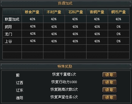 每个国家都有7个郡城,分成国都,郡城,县城三个级别,其中4个3级县城奖励都是4种资源产量增加40%;3个5级郡城的奖励:一个是1000行动力、一个是恢复2次跑商和一个是恢复1次声望任务 ;国都是恢复一次千重楼的挑战机会;