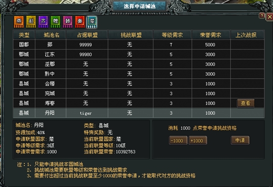 申请阶段由各联盟盟主申请攻打郡城,申请时间:每天的凌晨5点至18点为联盟申请时间,申请时不同的郡城会消耗不同的联盟荣誉,攻打不同的郡城都会有不同的联盟等级和荣誉需求;
