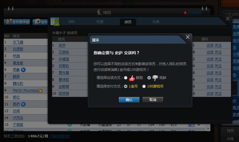 (3)跟其他队球员谈话一次需要1金币或者100游戏币。