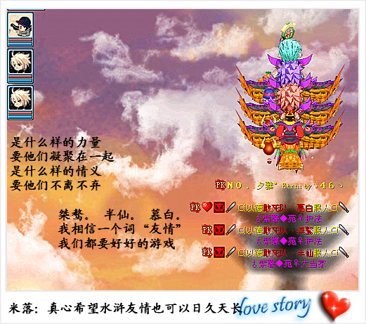 在网通武松区玩了一年多了,无论是比武还是野外还是贴吧或者论坛,都能看到网通四双鱼座敢死队的身影。传言他们的装备不是最厉害的。但是却无数次取得比武第一。所以崇拜他们很久的米落一直期望着合区,一睹他们的风采。