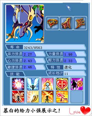 ① 半仙:首先比武吧,你看过慕白的小强就明白了。原来只有上面五个技能。这只小强充分证明某人是个混子角色,是吧。桀骜? 桀骜:嗯嗯,看过他的小强,让你明白他是一个拖我们后腿的比武混子。 米落:哇,我好期待什么样子的小强啊。 半仙:不过他后刷了4个技能,而且都是1级的。现在十个技能都没有满。 桀骜:米落,你说,哪个冠军队带这样的宝宝。 米落:我表示沉默 慕白:本人郑重声明,本人已经退出江湖,不问世事。从此江湖上只有哥的传说。 米落:慕白申诉无效,继续爆料