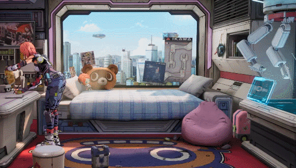游戏还为每个角色都做了一间宿舍。这些宿舍会通过房间风格、摆件种类、人物动作、语音对话,来塑造角色的魅力。