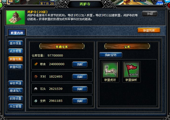 联盟的资源仓库包括黄金、粮食、木材、石头和生铁资源的数量。