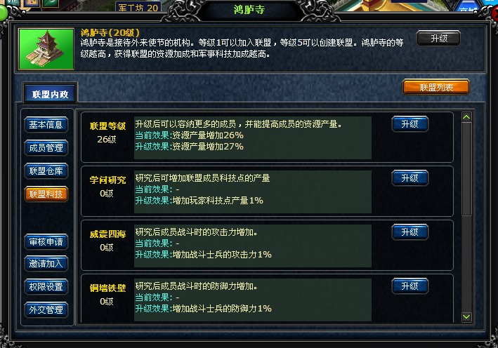 学问研究:研究后每级提升联盟内成员的科技点产量1%。