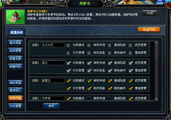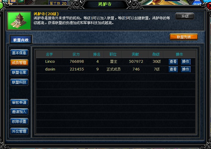 盟主及盟内被授予管理权限的人员可以在联盟内政界面进行盟内人员调整和管理。