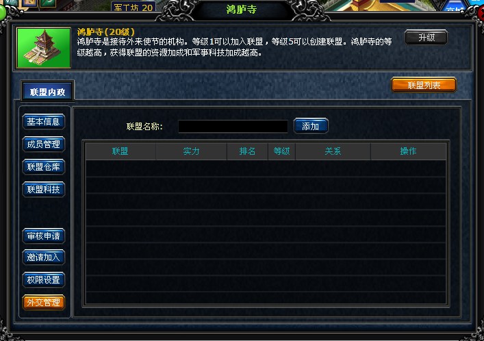 通过外交管理界面可以添加敌对联盟以及添加友好联盟。