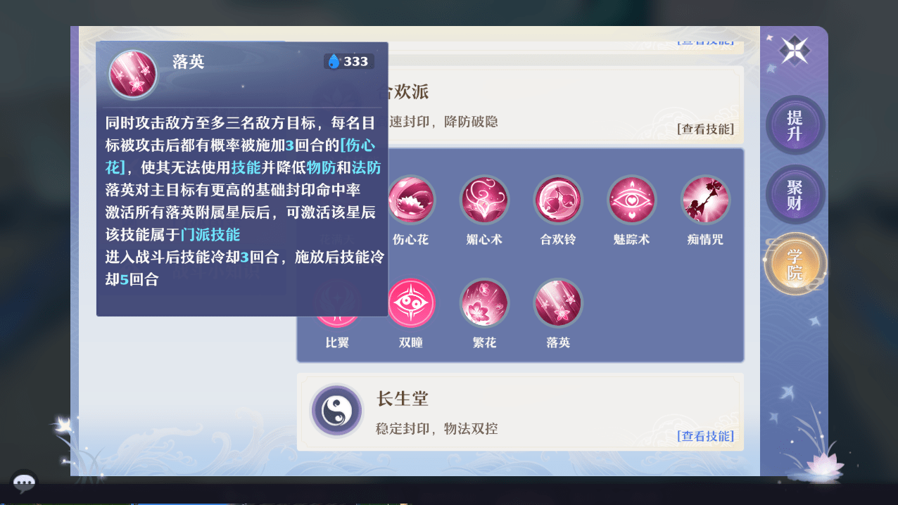 在高端局中,落英由于群封能力特别强,属于是在有蓝的情况下,只要CD好了直接就用的技能。而在没有落英的情况下,合欢再去使用伤心花或者媚心术这样的单封技能。