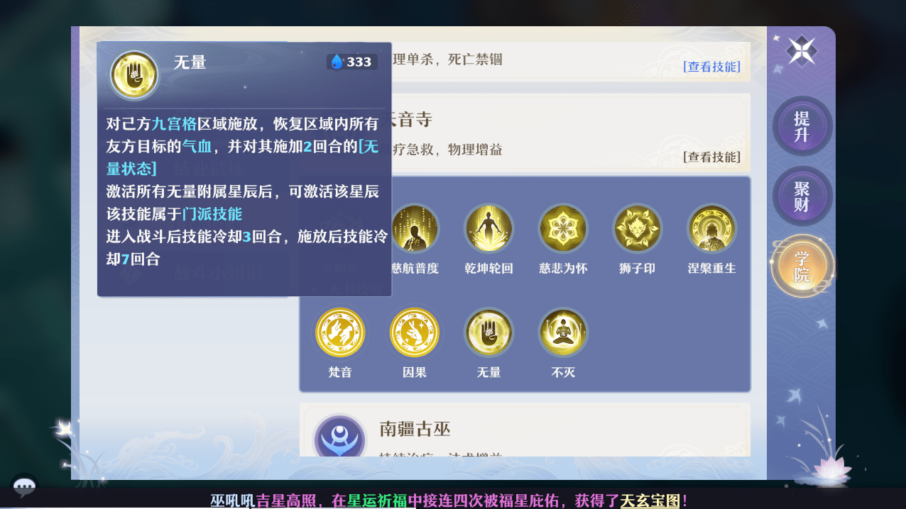 无量技能的存在,使得天音寺在PVP中的作用更为重要。一般来说,在战斗中受到伤害是很正常的事,而无量技能在使用之后,会减少被保护目标所受攻击的30%的伤害。所以这个技能在高端局中也是属于CD好了就放的。