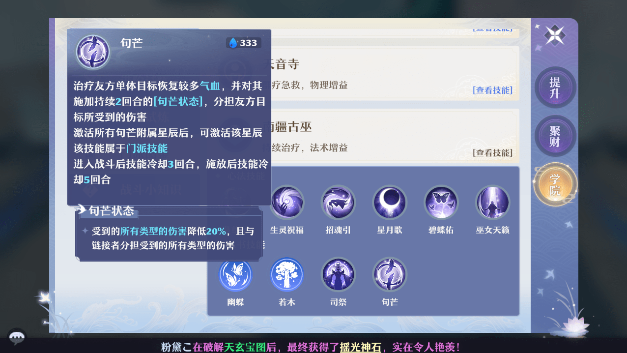 句芒是可以恢复友军单体较多气血的技能,同时会拉出一条连线连接目标和南疆。有的时候会用连线来保一些伤害高但是较脆的灵兽,但有的时候也会根据情况去治疗队友。(有点天音单加和长生堂拉线结合的感觉,不过这里连线是为了给队友分摊伤害,主动性更强。)