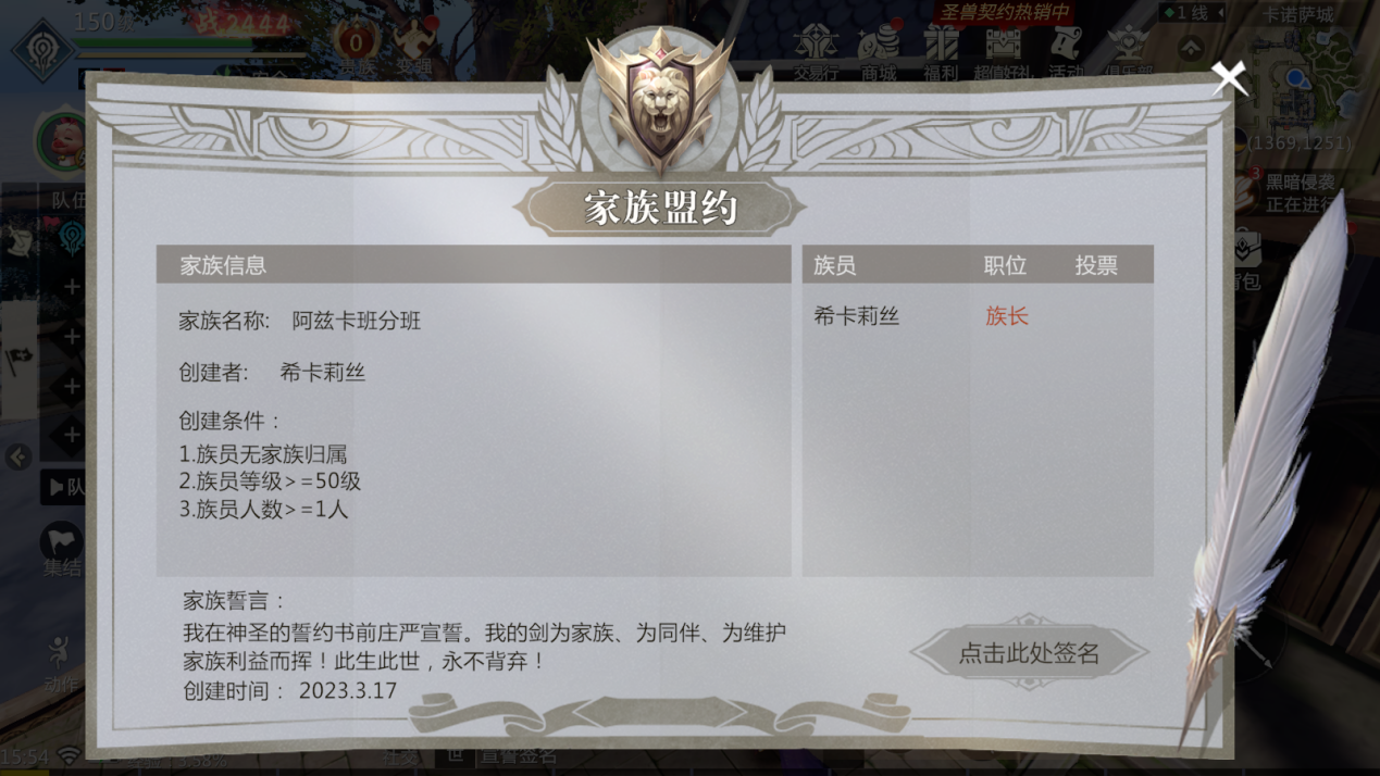 3、在家族创建页面,输入拟定好的家族名称,并通过所有成员的签名,才能完成家族创建。