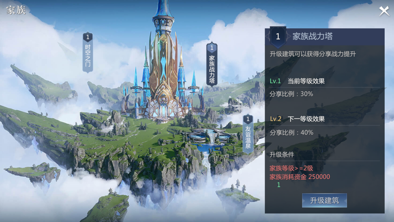 家族战力塔:同家族成员可获得战斗力最高成员的战斗力分享。