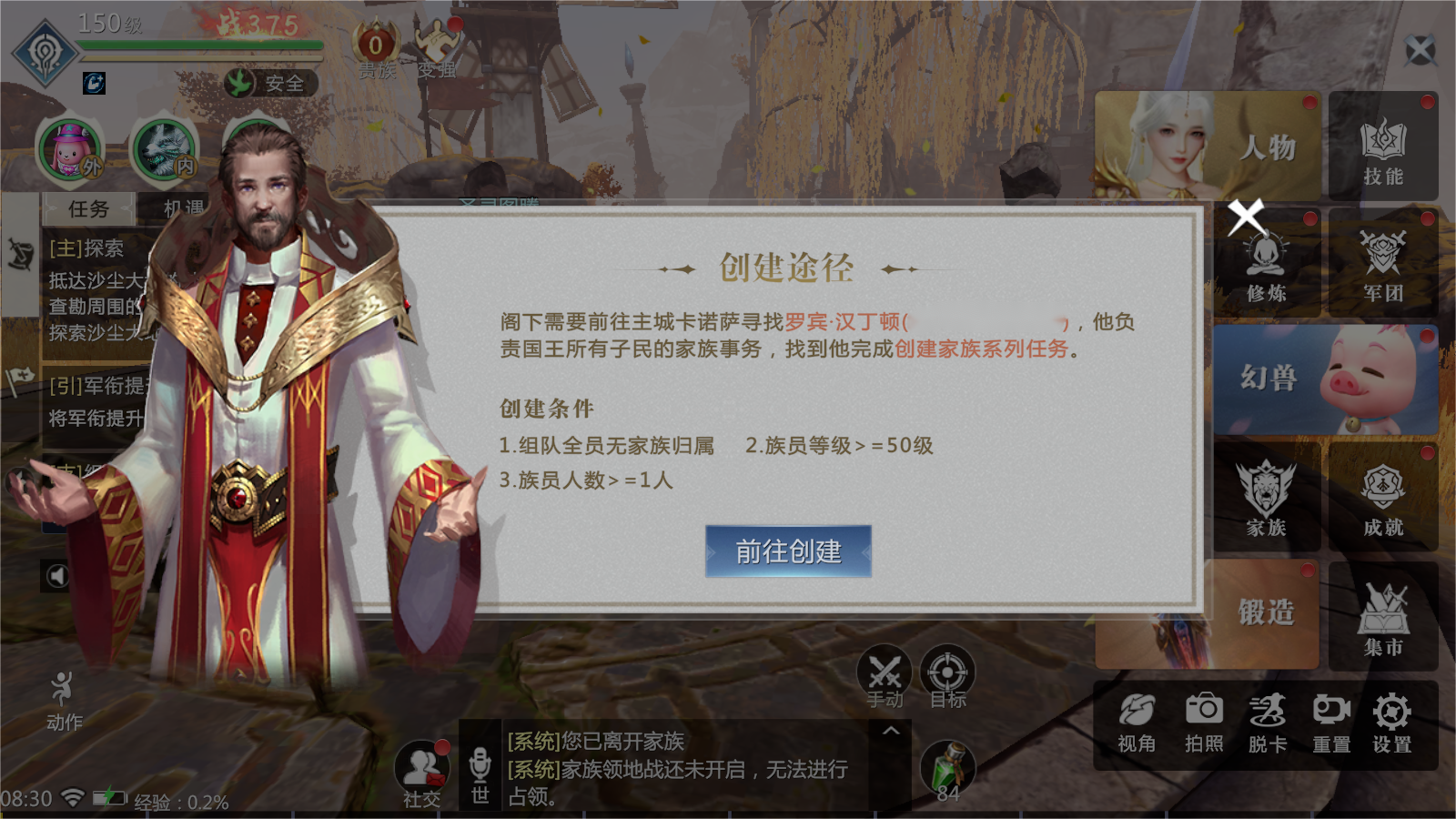 1、神选者开启组队状态,组成1-5人队伍,由队长带领来到卡诺萨城罗宾·汉丁顿(1370,1250)处,或通过菜单栏“家族”点击进入家族页面,点击“创建家族”指引前往罗宾·汉丁顿处。