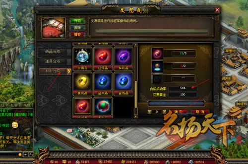 药品合成功能能让玩家的材料得到充分的利用,并为玩家省下大笔消费。点击文思阁,我们会来到下面的页面,可以看到有药品合成,道具合成,材料合成。选择药品合成发现很多商城出售的道具这里都可以合成。以玉露丹为例,点击玉露丹,在右侧会显示出合成所需要的材料,还有合成成功率,花费黄金。只要玩家材料足够,点击确定,那么我们就可以开始合成药品了。祝大家成功率100%。