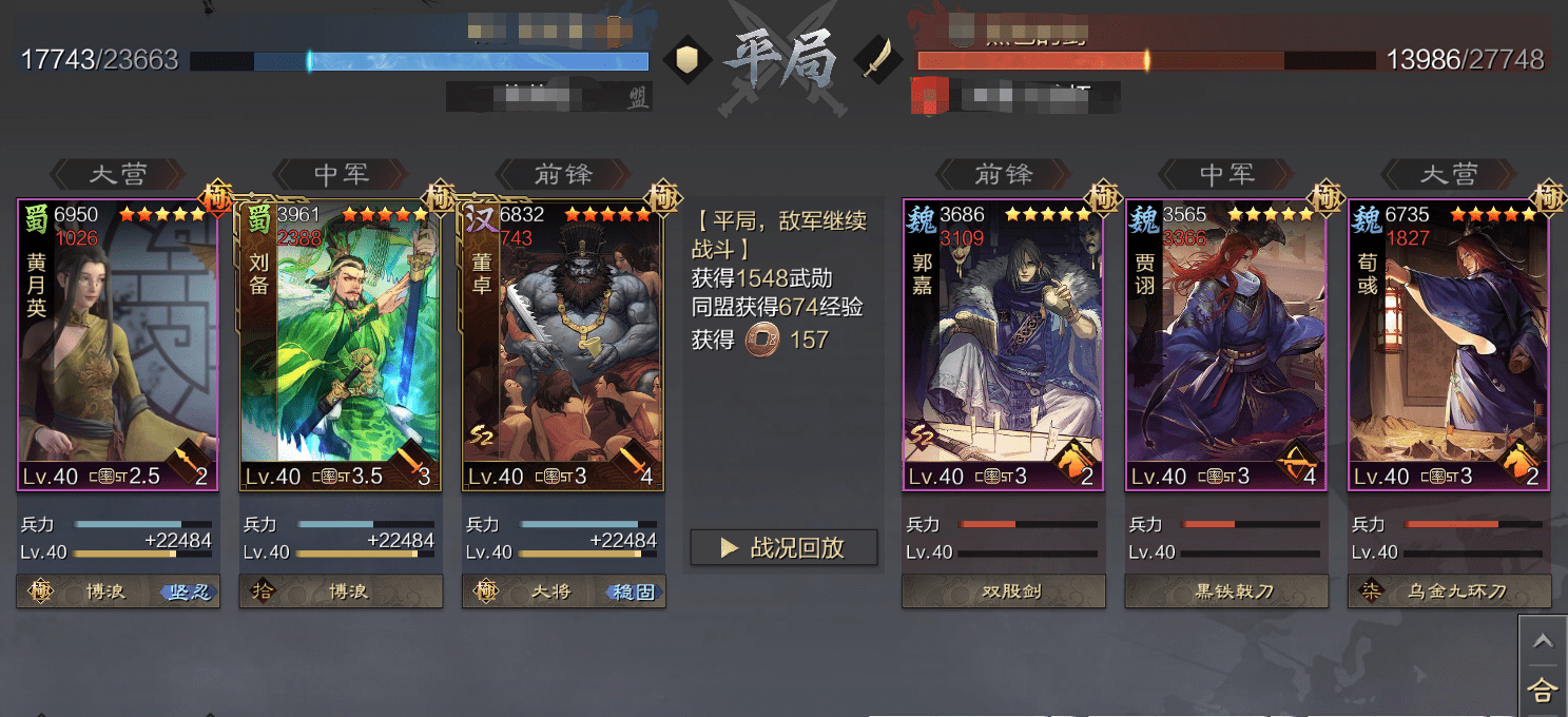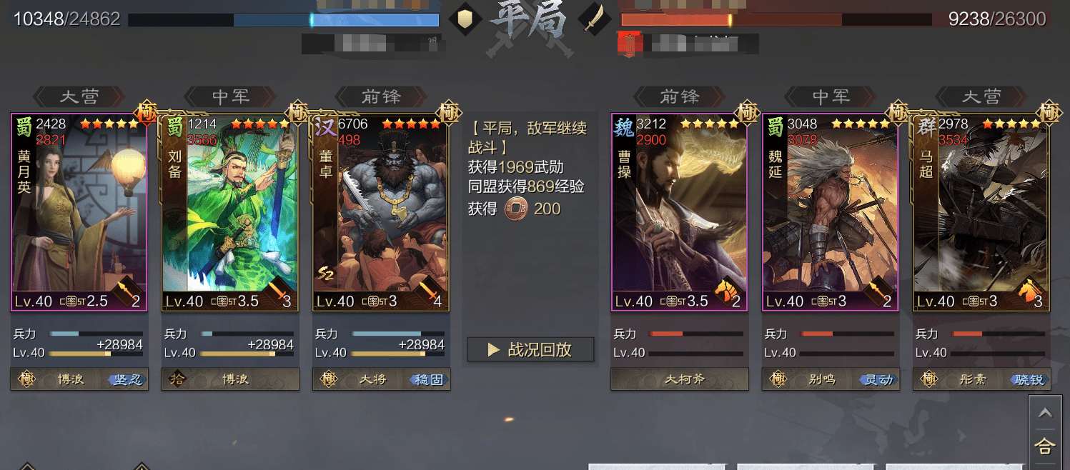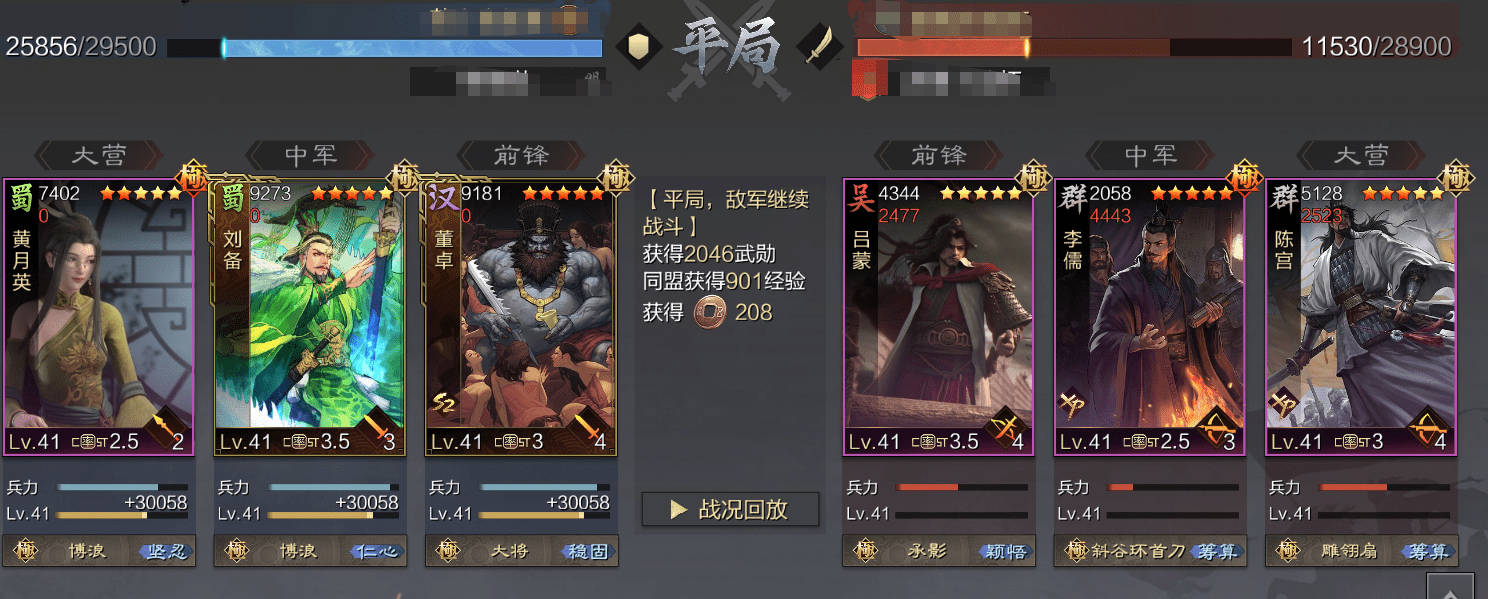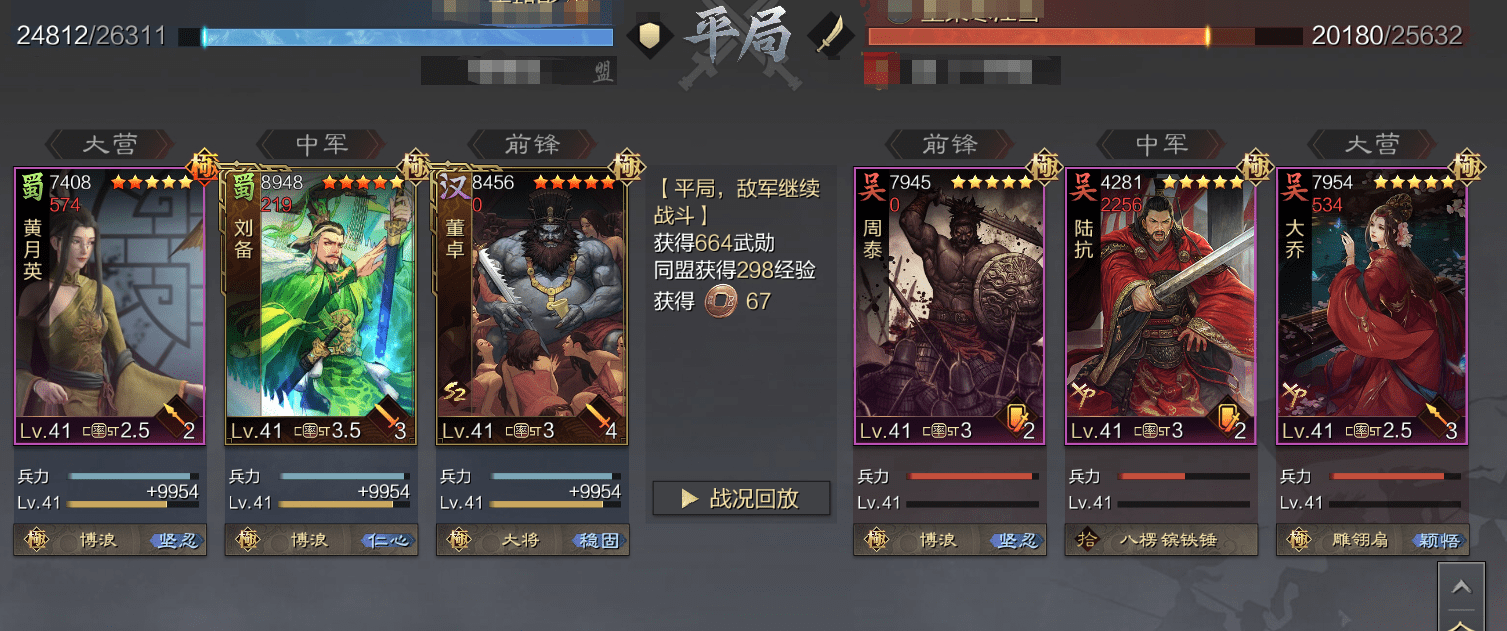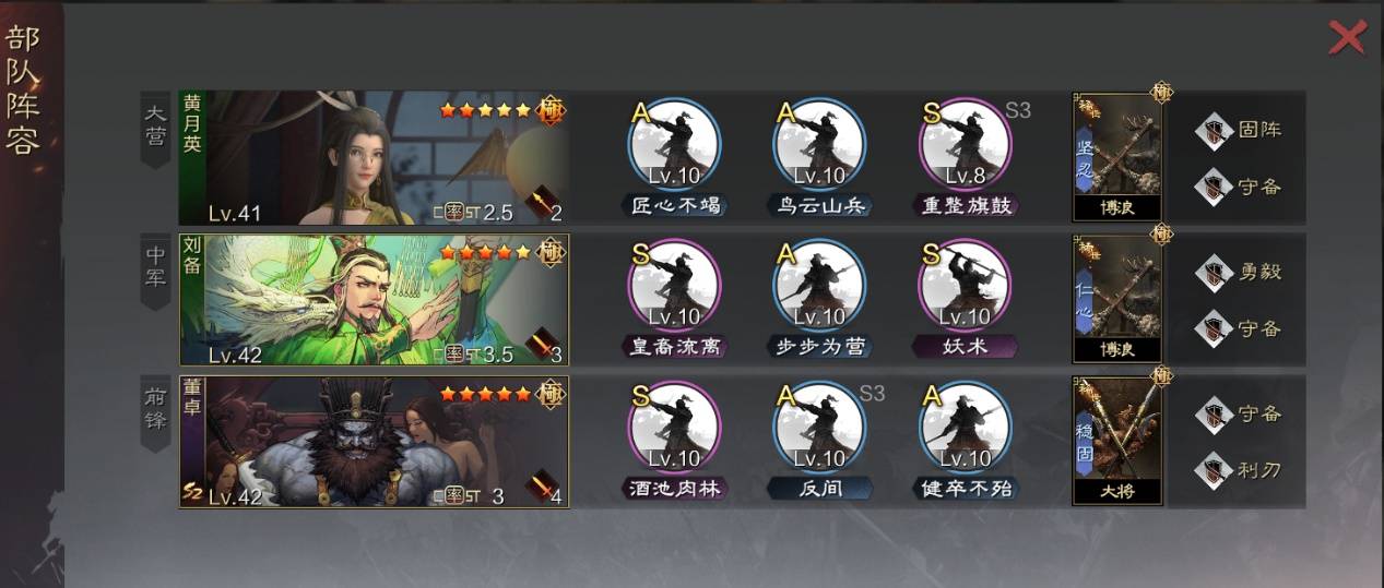 刘备则是作为辅助,自带战法让董卓的续航更强,同时带上步步为营来保证自己的生存能力,毕竟这队没有什么aoe减伤,全部都是带其他战法,让武将各凭本事。