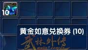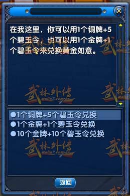 可选择一次用1个铜牌+5个碧玉令或1个金牌+1个碧玉令兑换1个黄金如意,或10个金牌+10个碧玉令兑换10个黄金如意。