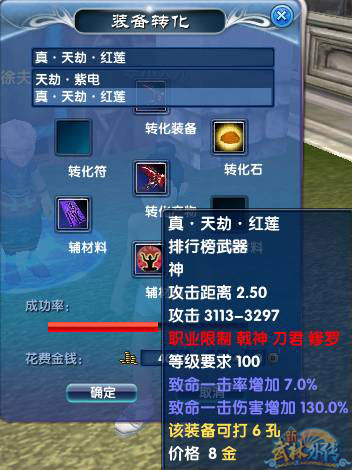 2、放入天劫•红莲,选择真•天劫•红莲后,再放入至尊符1个、补天石1个,转化石1个,转化符1个,并花费4000金就可以把老神圣武转化成新神圣武啦。
