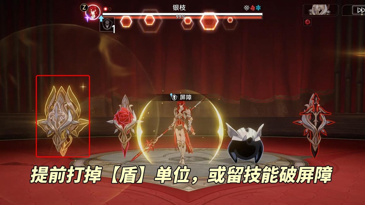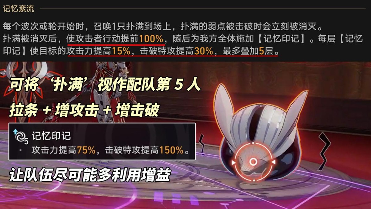 本期关卡buff:召唤一个扑满,击破扑满后攻击者行动提前100%,并使全队增加15%(75%)攻击力、30%(150%)击破特攻,可叠5次。非常强劲的增益,而扑满韧性条3单位,属性契合的情况下击破难度不高。