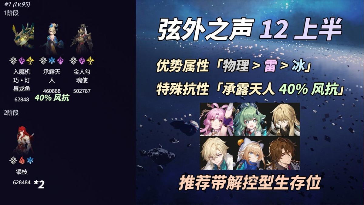 优势属性「物理>雷>冰」,承露天人有40%风抗。因有金人勾魂使的存在,生存位以具备插队解控、免疫或效果抵抗相关能力最优,如:符玄、藿藿、罗刹、砂金、玲可、加拉赫。