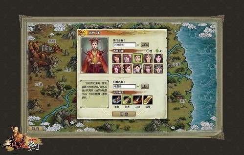 玩家进入游戏后,需要先选择游戏内掌门的头像,并且输入掌门名称,并且有随机按钮,玩家也可以随机生成掌门名称。还要输入门派名称,并选择自己的门派属于哪个派系,有拳脚,剑术,刀法,棍棒四种供玩家选择。当一切都妥当的时候点击确定按钮,确定后进入地区选择界面。