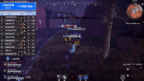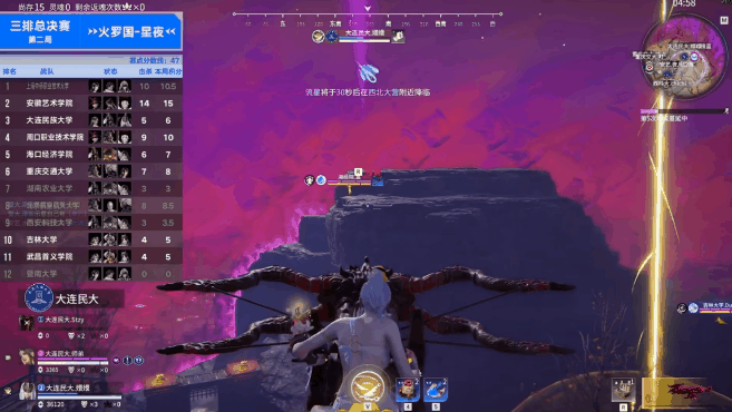 后续安艺.夜凡空雨接替大连民大.嬛嬛操控攻城弩,连续几发弩箭给各队挂上灼烧,落地开启奥义赤练无明成功晕住敌人,并配合队友将战场接管,将场上各队屠戮殆尽,夺得天选!
